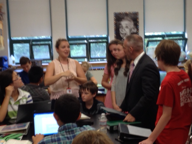 Last Wednesday, Massachusetts Secretary of Education Matthew Malone visited classrooms at Parker Middle School. During his visit, Secretary Malone had the opportunity to talk to students, teachers, administrators, and School Committee members about what is working in education and the challenges that we are facing. During his visit, Secretary Malone emphasized how it is the state’s responsibility to work with districts, remove obstacles, and make resources available for innovation in the classroom. He was extremely impressed with the focused engagement of students and the use of technology on the 4th day of classes.