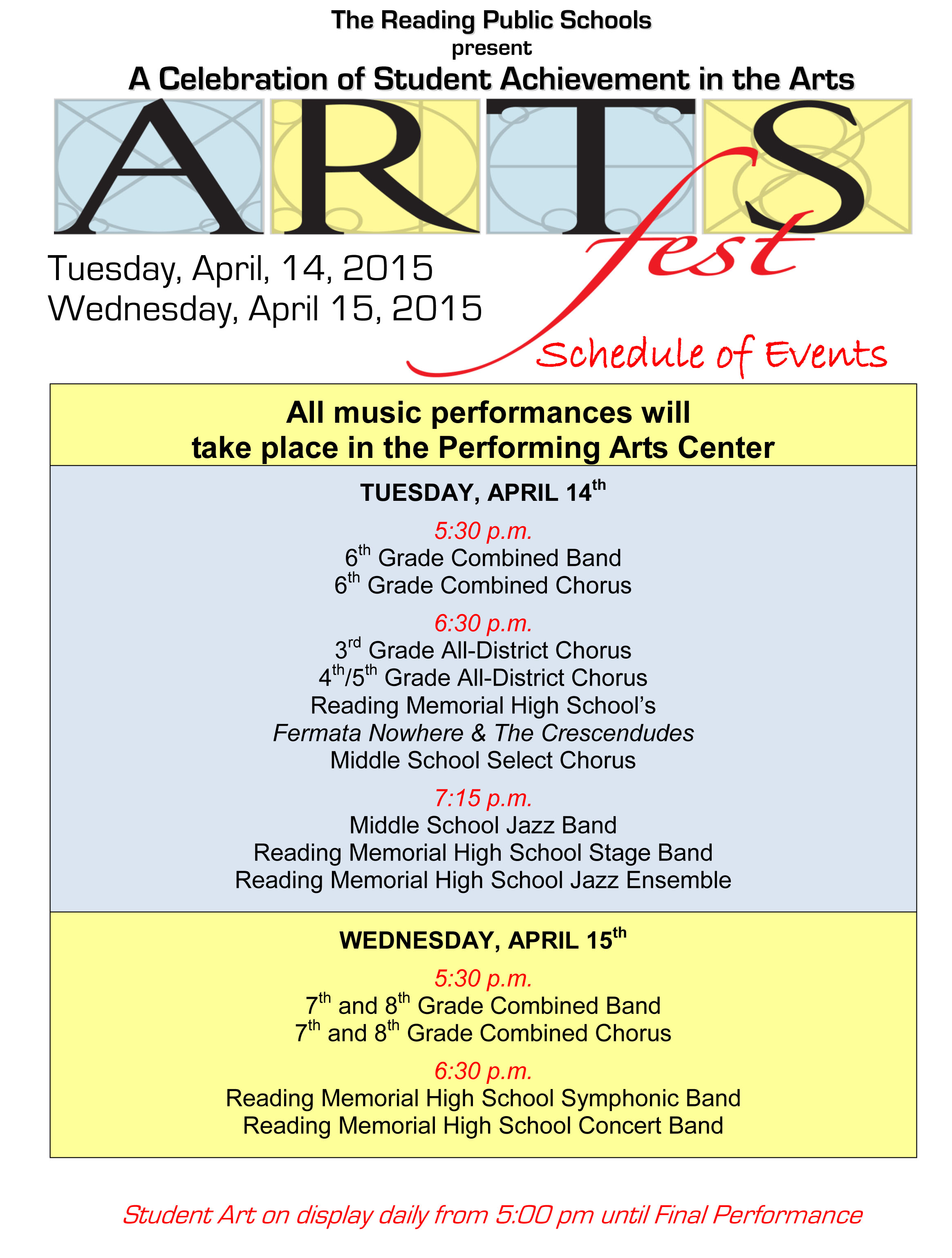 This past week, the Reading Public Schools celebrated the Arts and celebrated learning with two major events; the annual Arts Fest on April 14/15, and the Blueprint for Excellence Educational Institute on April 16/17. Both events emulate what our school district is all about; supporting student learning and fostering an environment that allows innovation and creation. It was truly a week of celebration!