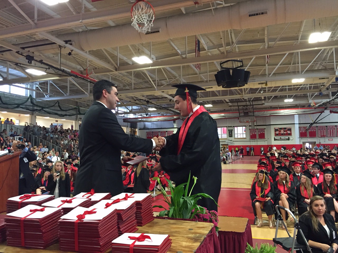 These individuals, of course, are just a few examples of the many personal accomplishments represented here today. Each of you have found your niche and your talents and have made contributions to our school and our community. You should be very proud of yourselves as a senior class, where you have been outstanding leaders and role models for the underclassmen. Collectively, this year alone you have had some amazing accomplishments. You have excelled on the athletic playing field with a state championship in Girls Ice Hockey, 5 Middlesex League Championships and spring sports teams still in tournament competition. In addition, Matt Dynan won a state championship in the mile run and Adam Morton won a state championship for his weight class in wrestling. You have shined in the visual and performing arts with four outstanding drama productions, a regionally recognized choral program, and award winning jazz band and color guard. Lauren Walsh, has earned many awards for her outstanding work in photography, including two prestigious gold keys in this year’s Scholastic Art and Writing Awards and a National Gold Medal which she will receive later this month at Carnegie Hall in New York City. In addition, our Robotics Team is among the best in the state, finishing strong and receiving the prestigious entrepreneurship award. Members of your class have also achieved academic success with 16 national merit commended scholars and one of your classmates, Peter Satterthwaite, received recognition as a national merit scholar and, was one of only fourteen students in Massachusetts who qualified for the prestigious United States Presidential Scholars Program. And, finally, all of you deserve congratulations for completing the necessary graduation requirements to be here today. Class of 2015, please give yourselves a round of applause.