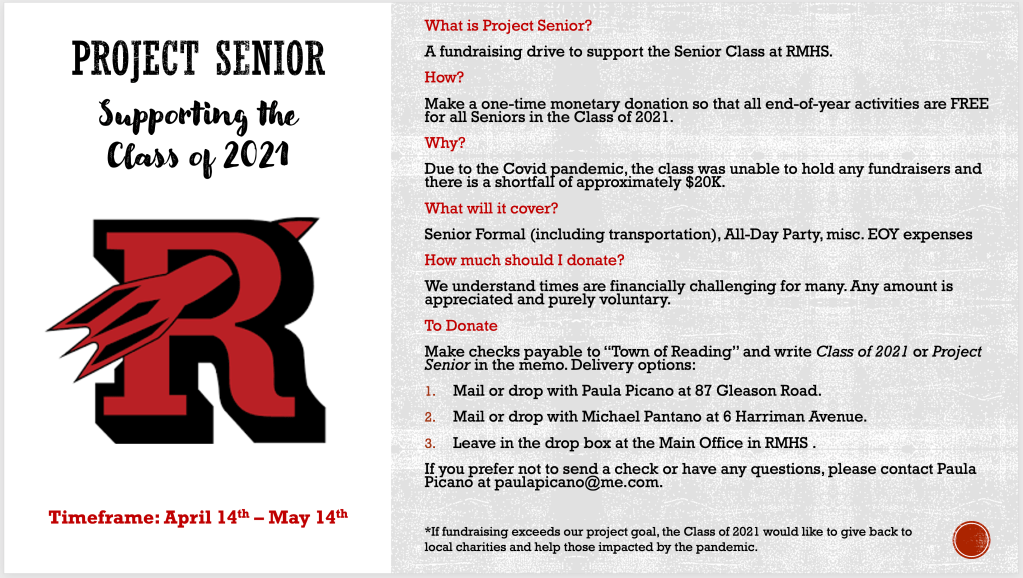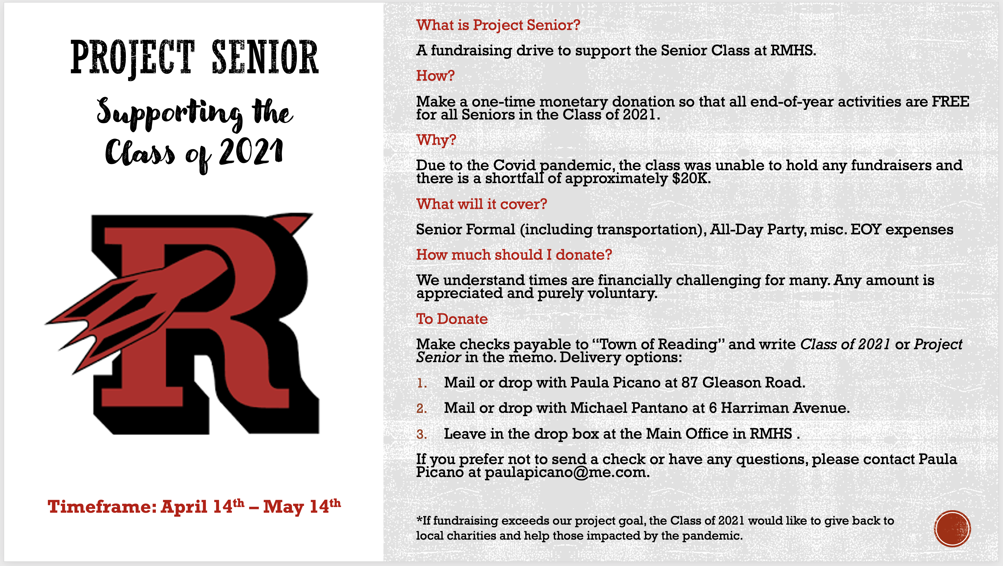 5. RMHS Fundraiser for Senior Class of 2021-Please see the information below for a fundraiser, called Project Senior, for the Class of 2021.